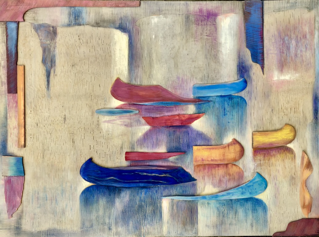 Acrylic, Coloured Pencil, Wood, and Birchbark on Plywood. 40 x 54.5 inches