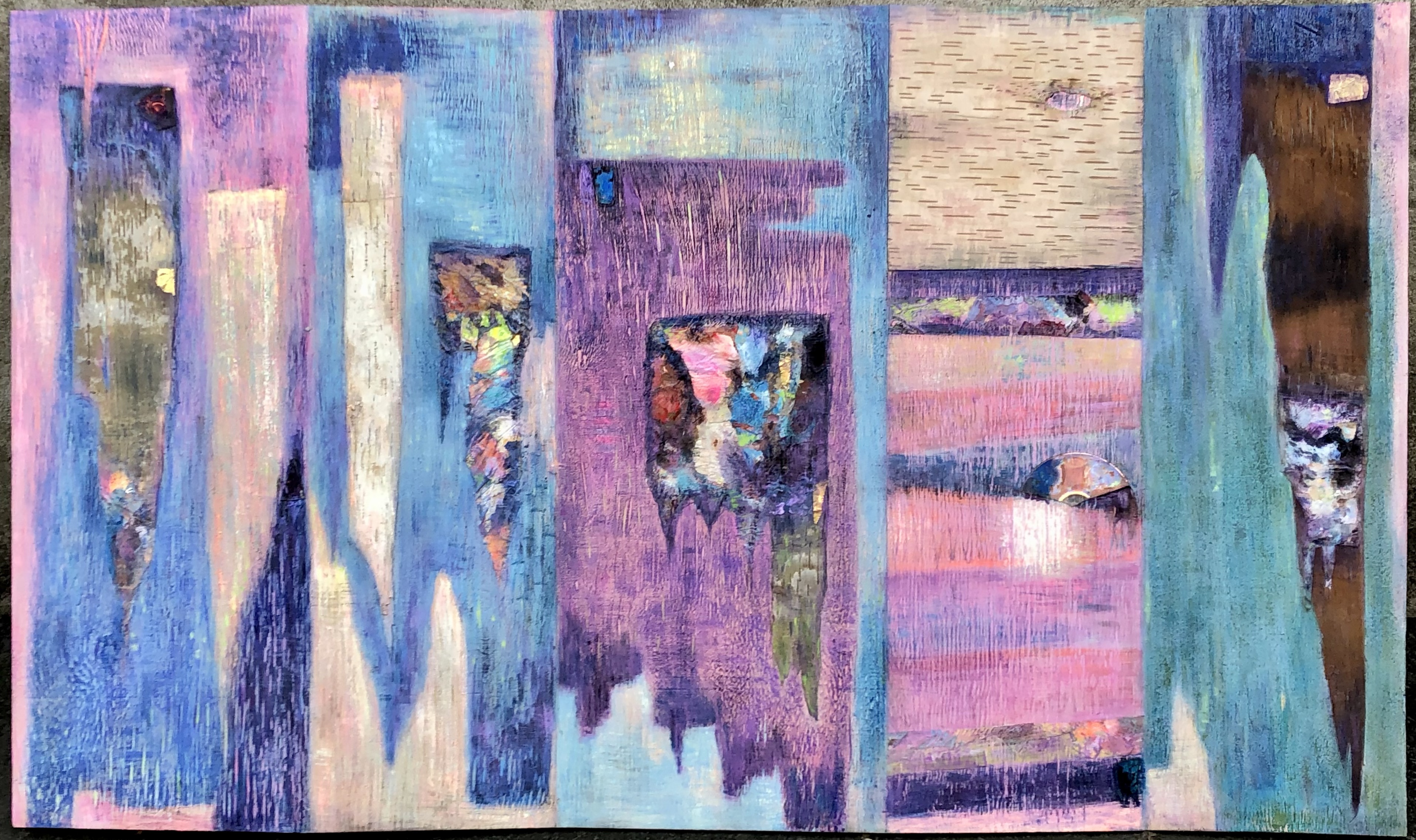 Acrylic, Coloured Pencil, Wood, and Birchbark on Plywood. 40 x 54.5 inches 2023-24