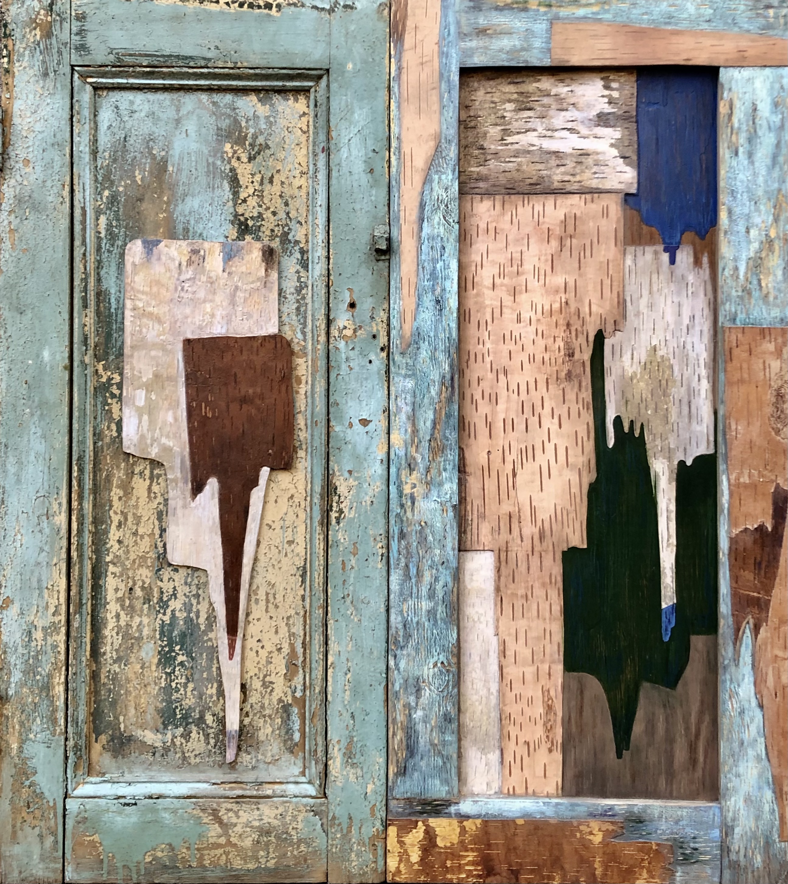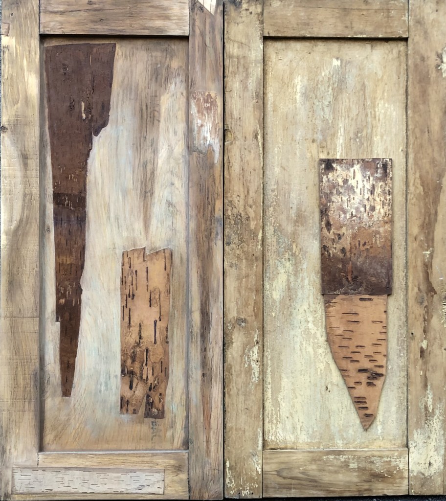 Acrylic, Coloured Pencil, Paint and Birchbark on Antique and Plywood 34.5 x 31 inches 2020