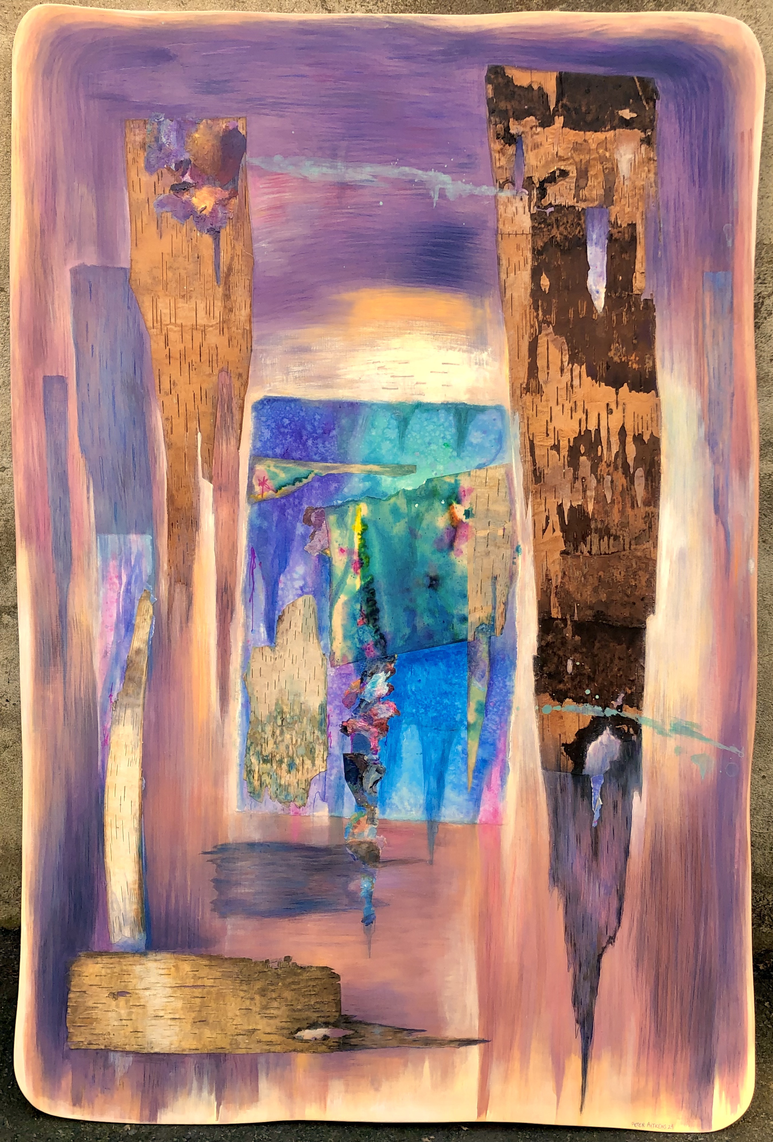 Acrylic, Coloured Pencil, Birchbark , and Paper on Plywood 59.75 x 39.5 inches 2021-24