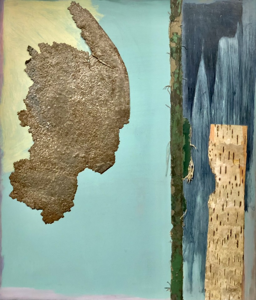 Acrylic, Birchbark, Metal, and Stone on Panel