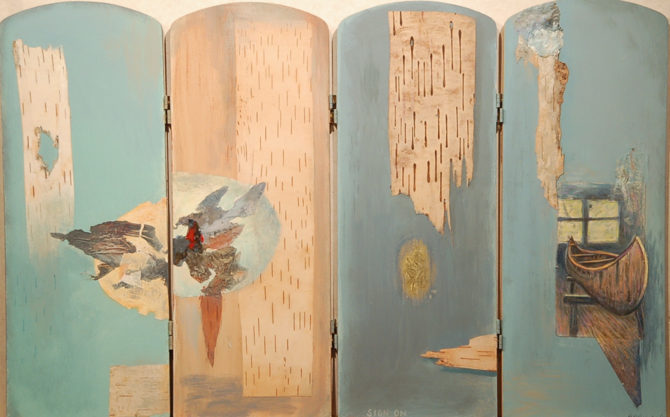 Acrylic, Birchbark, and objects on Plywood 16 x 32 inches 2014